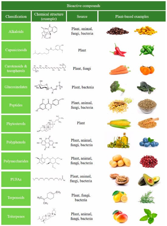Schematic representation of the classification of the main bioactive compounds in foods. Representative plant-based foods are shown, as well as sources and an illustrative chemical structure example.