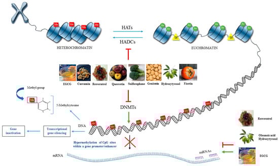 The four primary targets for epigenetic therapy are DNMTs, HDACs, HATs and miRNA; thereby, numerous bioactive compounds such as sulforaphane, tea polyphenols, ellagic acid, genistein, curcumin, hydroxytyrosol, resveratrol, organosulfur compound, oleanolic acid, and alkaloids have been studied as potent agents for regulating epigenetic mechanisms [,,]. Bioactive compounds can influence epigenetic processes through different mechanisms that interfere with the 1-carbon metabolism and affect S-adenosyl methionine (SAM) levels, meaning they are able to modulate DNA and histone methylation []. Many polyphenols, such as quercetin, fisetin, and myricetin, inhibit DNMT by decreasing SAM and increasing S-adenosyl-L-homocysteine (SAH) and homocysteine levels [].