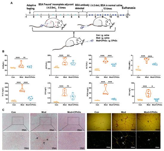 Effect of CPhGs on biochemical indicators and pathological changes in BSA-induced liver fibrosis rats. (A) Flowchart of the experimental protocol. (B) Changes in serum ALB, ALT, AST, TBIL, HA, PC-III, IV-C, and LN levels. (C) Pathological changes (arrows highlight the presence of portal fibrosis; for HE staining, the scale bar represents 100 or 200 µm; and for Sirius red staining, the scale bar represents 200 µm). Data are presented in violin charts, n = 6. * p < 0.05, ** p < 0.01, and *** p < 0.001. ns: not significant.
