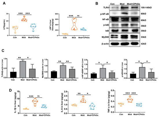 Effects of CPhGs on protein expression of TLR-4/NF-κB in liver tissues. (A) changes of the LBP in liver tissue and LPS in serum. (B,C) expression and quantitative results of proteins related to the TLR-4/NF-κB signaling pathway. (D) changes of the TNF-α, IL-6, IL-1β expression in liver tissues. Data were presented as mean ± SD or in violin charts. n = 6, * p < 0.05, and ** p < 0.01, *** p < 0.001. ns: not significant.