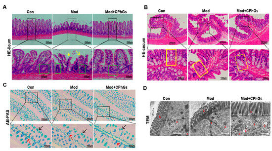 Effects of CPhGs on pathological observations of the intestinal tract. (A) effects of CPhGs on histomorphology in the ileum tissues (The yellow arrows point to fragmented intestinal villi; the green boxes circled are intestinal crypts, the scale bar represents 100 or 200 µm). (B) effects of CPhGs on histomorphology in the ileum and cecum tissues (The yellow boxes are secretory glands of the cecum, which were almost absent in the model group; the scale bar represents 100 or 200 µm). (C) the representative images of AB-PAS staining of intestinal tissues (The black arrows are immature goblet cells; the red arrows are goblet cells that are secreting; the scale bar represents 100 or 200 µm). (D) ultrastructural analysis in intestinal tissues by transmission electron microscopy (a: cell gap, b: intestinal villi, c: mitochondria, d: phagosome, at 30,000 µm magnification).