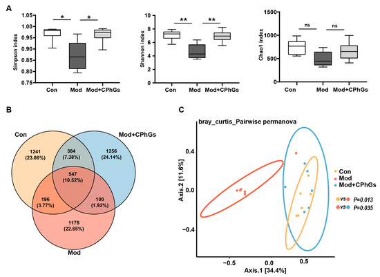Effects of CPhGs on gut microbiota dysbiosis in rats with BSA-induced liver fibrosis. (A) Chao1, Simpson, and Shannon indices analysis was performed to show α-diversity. (B) OTU Venn diagram. (C) Principal coordinate analysis (PCoA) was performed to show β-diversity. n = 6. * p < 0.05, ** p < 0.01. ns: not significant.