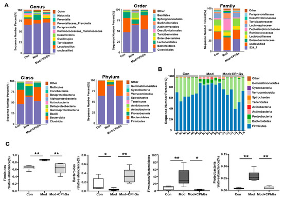 Perturbation of the gut microbiota has been reported to compromise the integrity of the intestinal barrier [18]. In our study, 16s rDNA sequencing was conducted on gut microbiota in rats to monitor changes in gut flora under different experimental conditions. The sequencing results were organized into operational taxonomic units (OTUs) as indicators for microbiota biodiversity. Using Venn diagrams, 4222 OTUs were detected, and 547 OTUs were common across the three groups; 1247 were specific for the control group, 1178 for the Mod group, and 1256 for the Mod + CPhGs group (Figure 5A,B). It has been recognized that among OTUs, α-diversity indices represent the overall degree of richness and evenness and reflect the microbiome diversity of single samples, including the Chao1 estimator, Simpson and Shannon indices. The Chao1 index represents the richness of microbial species, while the Shannon index and the inverse Simpson index reflect the evenness and richness of microbial communities, focusing, respectively, on rare and dominant microorganisms [19]. In our study, the α-diversity analysis reveals significantly reduced Simpson (p < 0.05) and Shannon indices (p < 0.01) in the model group compared to the control group, whereas the two indices were significantly improved after CPhGs intervention in the model group (p < 0.01).