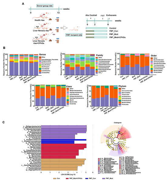 Rats were randomly assigned to the following four groups: control (Con), FMT control (FMT_Con), FMT model (FMT_Mod), and FMT Model + CPhGs (FMT_CPhGs) groups, with six rats in each group. Before FMT and except for the rats in control group, the remaining rats were treated with a combination of antibiotics (0.5 mL/100 g) for a period of 14 consecutive days, including 1 g/L metronidazole, 1 g/L ampicillin, 1 g/L neomycin, and 0.5 g/L vancomycin, to completely clear their gut microbiota. After the antibiotic intervention, the supernatants were then transplanted into the gut microbiota-depleted rats at a dosage of 2 mL per rat by gavage for a period of 4 weeks [30]. After the intervention (in the seventh week), all rats were sacrificed for the collection of serum and liver and gut tissues (Figure 9A).
