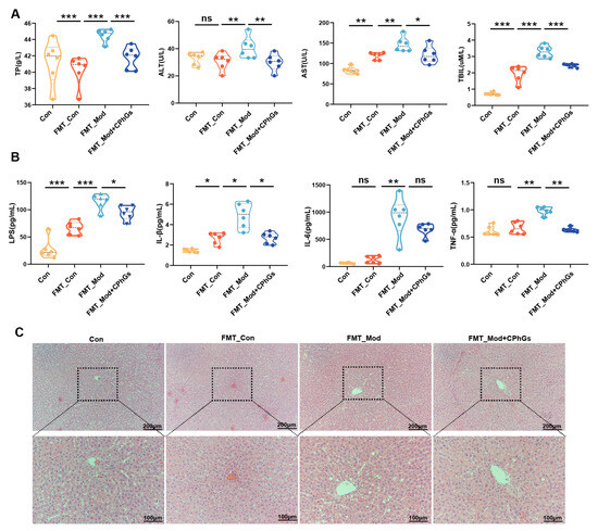 The results depicted in Figure 9 indicate that there were no significant differences between the control group and the FMT_Con group with respect to serum ALT, TBIL, TP, IL-1β, IL-6, and TNF-α levels. Conversely, the administration of fecal suspension from liver-fibrotic rats via gavage to recipient rats resulted in a significant increase in systemic inflammation and liver injury (p < 0.05, p < 0.01 or p < 0.001). Statistical analyses revealed a significant reduction in the levels of ALT, AST, TBIL, IL-1β, IL-6, and TNF-α in the FMT_Mod + CPhGs group compared to the FMT_Mod group (p < 0.05). In addition, histological examinations (Figure 9C) show that BSA treatment led to inflammatory cell infiltration and accumulation of abnormal liver tissues in the FMT_Mod rats, while FMT_Mod + CPhGs rats did not display significant liver pathology compared to the FMT_Mod group. These results indicate that CPhGs intervention may have provided a hepatoprotective effect in rats with BSA-induced liver injury, potentially through enhancing the resilience of microbiota. Furthermore, serum LPS was increased in all FMT groups, and serum LPS levels were significantly higher in the FMT_Mod rats than in the FMT_Mod + CPhGs and FMT_Con rats (p < 0.05), which again demonstrates that the health status of the donor rats was transferred to the recipient rats via FMT.