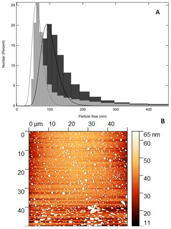 (A): Size distribution profile of the developed NC using dynamic light scattering technique. Unloaded/NC (gray) and QZ/NC (black) at 61 days after synthesis. (B): Two-dimensional photomicrograph of QZ/NC obtained using the AFM technique.