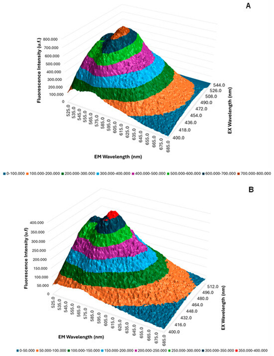 The 3D fluorescence emission spectra of QZ in acetonitrile and after nanoencapsulation (QZ/NC) were obtained as part of the spectroscopic characterization. Analyses were carried out using a fluorimeter (Shimadzu model RF-6000, San Jose, CA, USA) with the following parameters: emission wavelength (525–685 nm); excitation wavelength (400–520 nm); data interval: 2nm; excitation band: 1.5 nm; and emission band: 3 nm.
