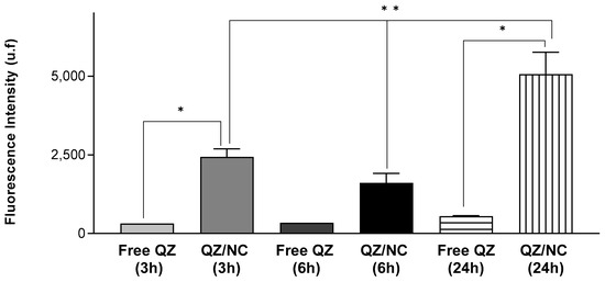 Cellular uptake study in HaCaT cells at a concentration of 15 μg.mL−1 evaluating the cellular internalization of free QZ and QZ-loaded nanocapsules (QZ/NC) at 3, 6, and 24 h. Statistical significance was determined using the one-way ANOVA test, with 95% significance level, followed by Tukey post-test for multiple comparisons, where * statistical difference obtained between free QZ and QZ/NC, ** statistical difference obtained between QZ/NC in the three tested times (p < 0.05).