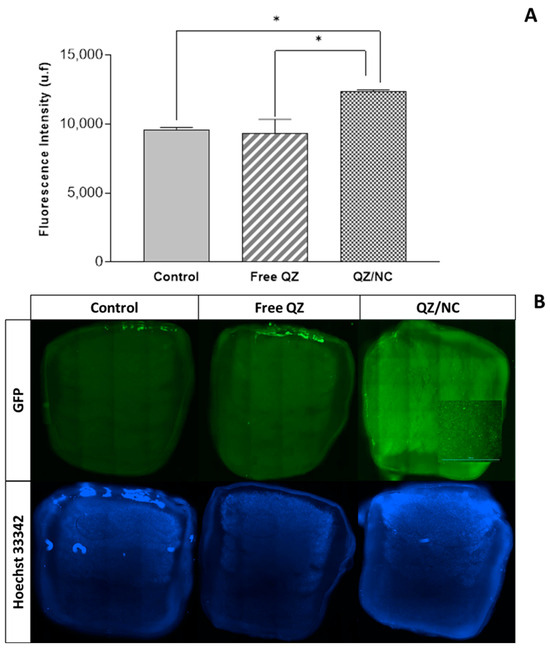 Analysis of permeation in the three-dimensional skin model by evaluating fluorescence intensity (A) and cross-sectional images and (B) using a SPARK microplate reader (TECAN, SWI) —scale bar indicates 3000 µm. The control, containing only DMEM, free QZ, and QZ/NC were analyzed. Statistical significance was determined using one-way ANOVA, at 95% significance level, followed by Tukey post-test for multiple comparisons (* p < 0.05).