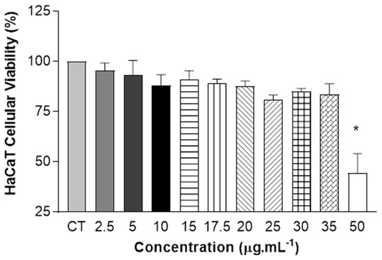 Safety tests from in vitro cytotoxicity assay of QZ/NC on human keratinocyte HaCaT (HaCaT—cell line service) at concentrations of 2.5; 5; 10; 15; 17.5; 20; 25; 30; 35; and 50 μg.mL−1 (QZ/NC). Statistical significance was determined using one-way ANOVA, at 95% significance level, followed by Tukey post-test for multiple comparisons (* p < 0.05).