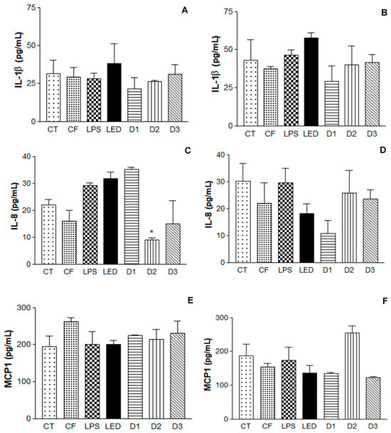 Enzyme-linked immunosorbent assay (ELISA) for the analysis of IL-1β, IL-8 cytokines, and macrophages MCP1 in human keratinocytes (HaCaT—cell line service) where (A,C,E) is the analysis 6 h after irradiation and (B,D,F) is the analysis 24 h after irradiation, where CT = control; LPS = lipopolysaccharide; LED = irradiation dose of 10 J. cm−2; D1 = QZ/NC irradiation dose of 1.0 J.cm−2; D2 = QZ/NC irradiation dose of 5 J.cm−2; D3 = QZ/NC irradiation dose of 10 J.cm−2; CF = formulation control (QZ/NC 15 μg.mL−1). Statistical significance was determined using the one-way ANOVA test, with a 95% significance level, followed by Dunnett’s post test (* p < 0.05).