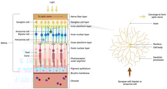 Although most current treatments have resulted in effectively controlled IOP, these approaches are not optimal as they fail to address the persistent loss of RGCs [11]. RGCs serve a pivotal function in visual processing by transmitting information from the retina to the brain and are the primary cellular component of the ganglion cell layer (GCL) [11,12]. The adult human eye contains approximately 1.2 million RGCs [13]. Cell bodies, intricate dendritic structures, and distinctive axons make up the structural components of RGCs [11]. Dendrites process photoreceptor impulses and receive synaptic input mostly from amacrine and bipolar cells, which act as intermediary neurons in the retina to transmit and modulate information from the photoreceptors (Figure 1). These interactions form a critical hierarchical network essential for the integration and processing of visual signals into nerve impulses. The action potentials generated then travel via the axons of RGCs, which merge to form the optic nerve. These axons pass through the optic disc and optic canal, forming synapses in the lateral geniculate nucleus (LGN) of the thalamus and partially in the superior colliculus (SC), thereby linking the visual pathway of the eye with that of the brain [14]. The LGN processes visual information, relaying it to the primary visual cortex for further complex analysis and integration, highlighting the crucial role of RGCs in visual perception [13,15].