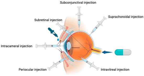 The effectiveness of common treatment methods is significantly compromised by the barrier effect of the BRB. Currently, the most prevalent methods of ocular drug delivery include topical administration or intracameral, suprachoroidal, subconjunctival, intravitreal, and subretinal injections, and finally, systemic administration (Figure 2) [41]. Table 2 presents the advantages and disadvantages of these modes of administration. These methods achieve varying degrees of therapeutic success, especially as their bioavailability is generally low, typically less than 5% (largely due to the BRB [42]). As a result, it is important to develop innovative techniques overcoming or bypassing the challenges imposed by the BRB.