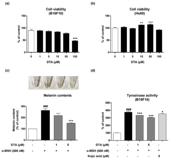 Effects of DTA on melanogenesis in α-MSH-induced B16F10 melanoma cells. Cell cytotoxicity was assessed in (a) B16F10 and (b) HS68 cells treated with various concentrations of DTA (1–100 μM) for 24 h (n = 4/group). (c) Intracellular melanin content and (d) tyrosinase activity were measured in B16F10 cells pretreated with various concentrations of DTA (1, 5 μM) and kojic acid (5 μM) for 1 h, followed by stimulation with α-MSH (500 nM) for 6 days (n = 4/group). Results are presented as mean ± SEM. ### p < 0.001 compared with the non-treated control group and * p < 0.05, ** p < 0.01, *** p < 0.001 compared with the α-MSH-treated group.