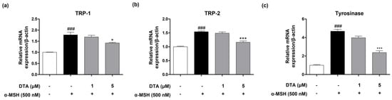 Effects of DTA on the expression of melanogenesis−related genes in B16F10 cells. Real-time PCR analysis of mRNA levels of (a) TRP-1, (b) TRP-2, and (c) tyrosinase in B16F10 cells treated with α-MSH and various concentrations of DTA (1 and 5 μM). The results show a significant downregulation of these genes in a dose-dependent manner with DTA treatment. Results are presented as mean ± standard error of the mean (SEM). ### p < 0.001 compared with the non-treated control group, and * p < 0.05 and *** p < 0.001 compared with the α-MSH-treated group.