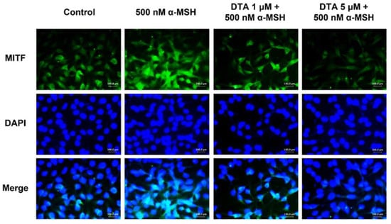 Immunofluorescence staining was performed according to previously established protocols. B16F10 cells were treated with 1 μM and 5 μM of DTA, and then 1 h later, they were treated with 500 nM α-MSH and stimulated for 6 days. Cells were washed twice with PBS and fixed with 4% paraformaldehyde for 15 min. After fixation, the membrane was washed again with PBS and treated with 0.5% Triton X-100 for 5 min to permeabilize the membrane. Next, cells were incubated with MITF 1 antibody (1:100, sc-515925, Santa Cruz Biotechnology, Santa Cruz, CA, USA) overnight in the dark. Cells were washed with PBS and incubated with FSD™ 488-conjugated secondary antibody (1:500, RSA1145, BioActs, Incheon, Republic of Korea) for 1 h. Cell nuclei were counterstained with DAPI (4′,6-diamidino-2-phenylindole dihydrochloride), cells were observed under a fluorescence microscope, and images were taken.