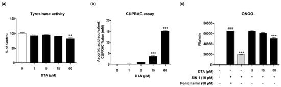 Oxidative stress can induce melanin production, and antioxidants can inhibit melanin synthesis by reducing oxidative stress. Therefore, in this study, we investigated the antioxidant effects of DTA using the CUPRAC assay and peroxynitrite (ONOO−) assay. The results showed that DTA increased the reducing power in the CUPRAC assay at concentrations of 15 μM and 60 μM (Figure 5b). Additionally, SIN-1-induced ONOO- levels were slightly reduced at 60 μM DTA (Figure 5c). Specifically, at higher concentrations (60 μM), DTA demonstrated both an inhibitory effect on mushroom tyrosinase activity and antioxidant activity.