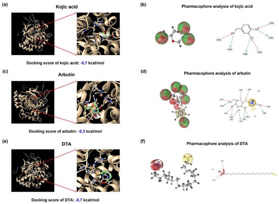 Computational docking analysis of tyrosinase with kojic acid, arbutin, and DTA. Binding affinity analysis between tyrosinase (PDB ID: 2Y9X) and various compounds computational structure prediction for docking simulation between mushroom tyrosinase and various compounds, including (a) kojic acid, (c) arbutin, and (e) dodecanoic acid (DTA). The ligand binding abilities were predicted using AutoDock Vina 1.1.2 software. The indicated boxes show the enlarged images of the binding sites within the tyrosinase structure. The docking scores were: kojic acid (−5.7 kcal/mol), arbutin (−5.3 kcal/mol), and DTA (−5.7 kcal/mol). Pharmacophore analysis was performed to analyze the binding residues of (b) kojic acid, (d) arbutin, and (f) DTA with tyrosinase.