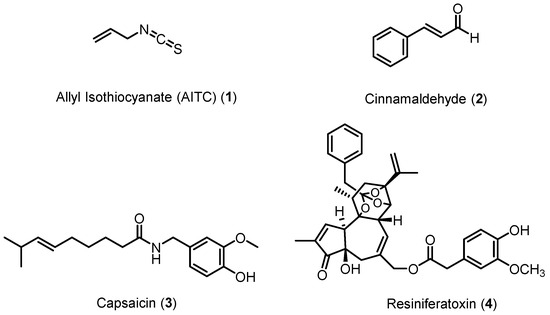 - Giorgi, S.; Nikolaeva-Koleva, M.; Alarcón-Alarcón, D.; Butrón, L.; González-Rodríguez, S. Is TRPA1 burning down TRPV1 as druggable target for the treatment of chronic pain? Int. J. Mol. Sci. 2019, 20, 2906. [Google Scholar] [CrossRef] [PubMed]