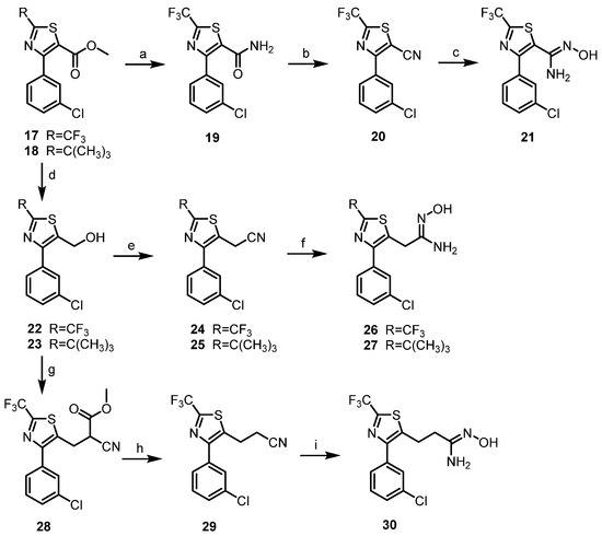 - 3-(4-(3-Chlorophenyl)-2-(trifluoromethyl)thiazol-5-yl)-N’-hydroxypropanimidamide (30). Compound 30 was synthesized from 29 according to general procedure C. 77% yield, colorless oil; 1H NMR (400 MHz, DMSO-d6) δ 8.93 (s, 1H), 7.62–7.63 (m, 1H), 7.56–7.58 (m, 1H), 7.50–7.51 (m, 2H), 5.48 (s, 2H), 3.21 (t, J = 7.1 Hz, 2H), 2.36 (t, J = 7.4 Hz, 2H).