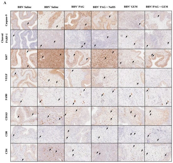 Caspase-9+ cells were preserved in all BBN+ groups compared to the BBN+ saline group (Figure 4B). PARP-1+ cells were induced in the BBN+ PAG, BBN+ GEM, and BBN+ PAG + GEM groups (p < 0.05, p < 0.0001, and p < 0.0002, respectively) but preserved in the BBN+ PAG + NaHS group compared to the BBN+ saline group (Figure 4C). PARP-1+ cells were further induced in the BBN+ PAG + GEM group compared to the BBN+ PAG group (p > 0.002, Figure 4G). Ki67+ cells were reduced in the BBN+ PAG, BBN+ GEM, and BBN+ PAG + GEM groups (p < 0.002, p < 0.002, and p < 0.0001, respectively) but preserved in the BBN+ PAG + NaHS group compared to the BBN+ saline group (Figure 4D). VEGF+ cells were reduced in the BBN+ PAG, BBN+ PAG + NaHS, BBN+ GEM, and BBN+ PAG + GEM groups compared to the BBN+ saline group (p < 0.0002, p < 0.05, p < 0.0002, and p < 0.0002, respectively; Figure 4E). Moreover, VEGF+ cells were further reduced in the BBN+ PAG + GEM group compared to the BBN+ PAG group (p < 0.05, Figure 4E). F4/80+ macrophages were induced in the BBN+ PAG group (p < 0.002) but preserved in all other BBN+ groups compared to the BBN+ saline group (Figure 4F). CD163+ macrophages were not altered in any group (Figure 4G). CD8+ T cells were induced in the BBN+ PAG and BBN+ PAG + GEM groups (p > 0.05 and p > 0.0001, respectively) but preserved in all other BBN+ groups compared to the BBN+ saline group (Figure 4H). Moreover, CD8+ T cells were further induced in the BBN+ PAG + GEM group compared to the BBN+ GEM group (p > 0.002, Figure 4H). CD4+ cells were reduced in the BBN+ PAG group (p < 0.05) but preserved in all other BBN+ groups compared to the BBN+ saline group (Figure 4I).