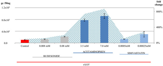 AAV/DJ transduction efficiency of the HEK-293 cell line in the presence of budesonide (gray bars), acetaminophen (dark blue bars), and simvastatin (light blue bars). Results are presented as the genome copy number ± standard deviation. The control group (red bar) was the HEK-293 cells transduced with rAAV/DJ alone. The area plot shows the fold change in transduction efficiency of HEK-293 cells with the rAAV/DJ vector in the presence of drugs compared with the control and is expressed as a percentage.