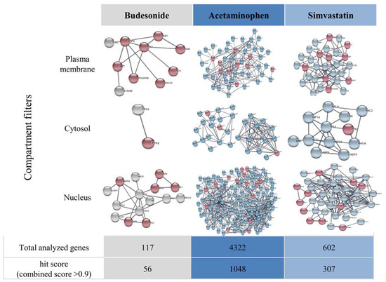 Correlation analysis between rAAV transmission genes (red nodes) and drug-modified genes (gray, dark blue, or light blue for budesonide, acetaminophen, or simvastatin, respectively) using a STRING database [4]. The obtained hits were divided into selected cellular compartments (plasma membrane, cytosol, and nucleus) presented horizontally in the graph. The hit score constitutes the combined score > 0.9, which is computed by combining the probabilities from the different evidence channels and correcting for the probability of randomly observing an interaction.