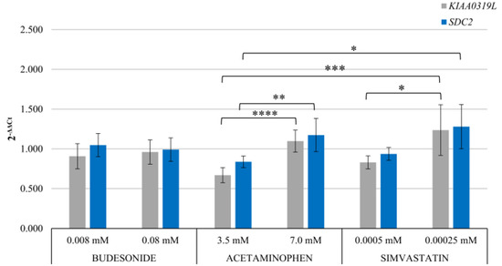 Expression of rAAV receptors, KIA319LL and SDC2, in HEK-293 cells after treatment with budesonide, acetaminophen, and simvastatin. The statistical significance was analyzed between the samples treated with medicines (* p < 0.05, ** p < 0.01, *** p < 0.0001, and **** p < 0.00001) using a Kruskal–Wallis test and a subsequently performed post hoc test, Dunn’s test.