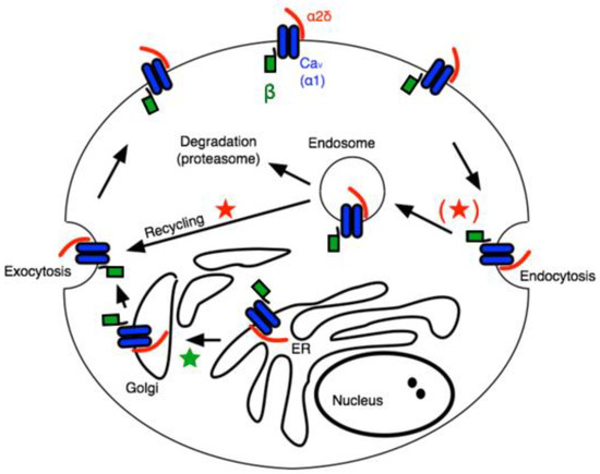 The α2δ subunits are multi-domain subunits covalently linked but translated from a single gene [17]. α2δ is mainly an extracellular protein with a GPI anchor, although deletion of the anchor does not impair its ability to regulate CaV channels [18]. Co-expression of any α2δ subunit with a β subunit and a CaV1 or CaV2 channel (in HEK cells, for example) further enhances the current density [14]. The mechanism for this increased current density is often attributed to general “trafficking” effects, but the precise role of α2δ in calcium channel trafficking is complex. A recent study appears to have uncovered a role for α2δ, primarily in the context of the action of GPs on calcium currents [19]. In that study, the authors found that the effect of GPs, which have been widely reported to bind to α2δ-1 or -2 to ultimately reduce calcium current density in a variety of cell types [8,9], was to prevent one specific function of α2δ, namely the recycling of Cav channel complexes, previously internalized, back to the plasma membrane. The model in Figure 1 illustrates a simplified but useful model describing these roles, wherein the primary role of β subunits is to facilitate newly translated Cav channels from the ER, through the secretory pathway to the plasma membrane (★), while the association with α2δ subunits reduces the rate of internalization, and in the endosomal compartment, it promotes recycling of channels previously internalized into endosomes back to the plasma membrane (★) [19]. This model is consistent with much of what is known about the role of accessory subunits on CaV channel expression and trafficking. Assuming some constitutive rate of new protein synthesis as well as channel internalization followed by either degradation or recycling, it can explain how the expression of both β and α2δ expression can enhance current density.