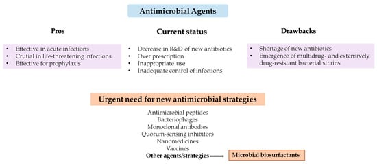 The vast majority of antibiotics were discovered between 1929 and 1962 []. Since the 2000s, only oxazolidinones, such as cycloserine and linezolid, and the cyclic lipopeptide daptomycin entered the market []. Over the last few decades, most of the pharmaceutical industries have decreased their interest in the research and development of antimicrobial drugs because they do not assure market expansion and revenues []. Several strategies have been proposed to address the shortage of new antibiotics and, more importantly, to overcome bacterial resistance (Figure 1). These alternative approaches include the development of antimicrobial peptides, bacteriophages and their encoded endolysins, monoclonal antibodies, quorum-sensing inhibitors, nanomedicines, vaccines, and antibiofilm agents [,,].