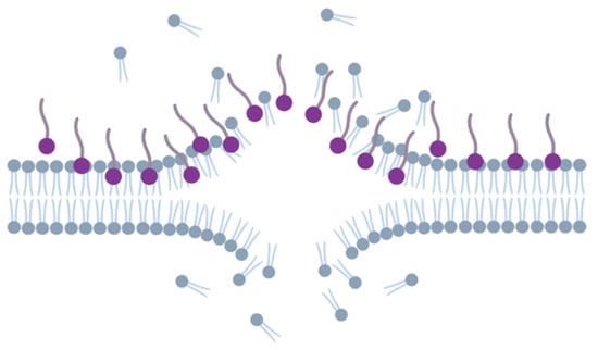 The antimicrobial activity of many biosurfactants arises from their ability to disrupt the lipid bilayer of membranes, ultimately resulting in cell death [,]. This process of membrane rupture starts with the mBS binding to the membrane surface, inducing structural alterations. Subsequently, reorganization takes place within the membrane, culminating in its rupture and cell lysis (Figure 3) [,,,].