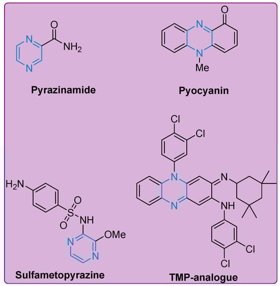 Heterocycles are a crucial class of compounds in chemistry because of their numerous medicinal applications, importance in developing novel materials, and rampant presence in natural products. Numerous biological studies have investigated pyrazine- and phenazine-containing substances for their therapeutic relevance to human health and disease. In 2019, the WHO Model List of Essential Medicines included four pyrazine-based compounds (amiloride, pyrazinamide, bortezomib, and paritaprevir), the FDA-approved pyrazine-containing antibacterial agents are mentioned in Figure 1 [,].