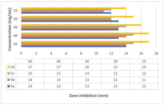 Agar well diffusion was used to test the compounds (5a–5d) for antibacterial effects against XDR-S. Typhi at five doses (10, 20, 30, 40, and 50 mg/well). When the concentration of chemicals rises, so does the zone of inhibition (mm). When compound (5d) was concentrated at 50 mg/mL, it exhibited the largest zone of inhibition, measuring 17 mm, compared to the other compounds. However, compounds (5a and 5b) showed (14 mm), and 5c (15 mm) (Figure 2).