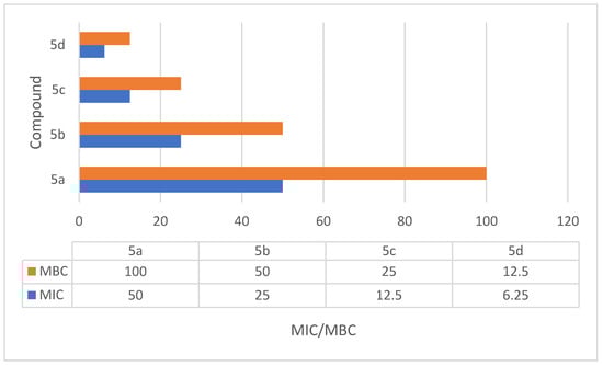 The results displayed the compound (5a) showed MIC 50 mg/mL and MBC 100 mg/mL, compound (5b) MIC 25 mg/mL and MBC 50 mg/mL, compound (5c) showed MIC 12.5 mg/mL and MBC 25 mg/mL, and compound (5d) showed MIC 6.25 mg/mL and MBC 12.5 mg/mL. The results showed that 5d is the most potent compound while 5a showed the least activity in the series as shown in Figure 3.