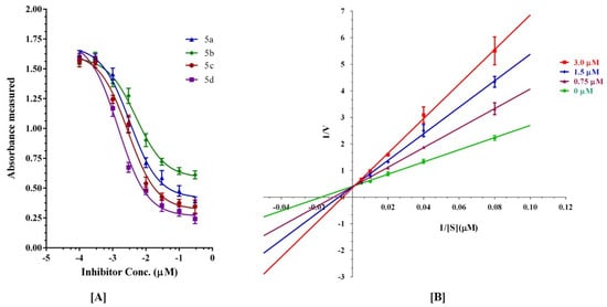 (A) IC50 curves for the synthesized compounds against alkaline phosphatase, (B) the Lineweaver Burk plot for enzyme kinetics studies showing that 5d is a competitive alkaline phosphatase inhibitor.