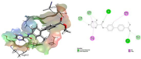 The binding energy for compound 5d within the predicted active pocket of the target protein was found to be ΔG = −6.3891 kCal/mole, which is higher than that of the reference compound ciprofloxacin. Here, the molecule established two hydrogen bonds with Lys550 and Gln546, involving the oxygen of carbonyl carbons of 5d. This molecule also established four conventional carbon–hydrogen bonds with Tyr557, Glu575, and Arg612, with pyrazine moiety and carbonyl carbon in the four carboxylate groups. In addition, π–alkyl interactions were also observed with Ile578 and Arg615, as presented in Figure 5. The binding modes of compounds (5a,5b,5c) with active pocket are shown (Supplementary Information Figures S4–S6).