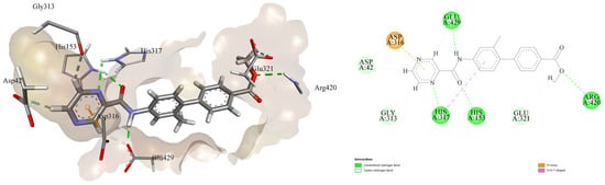 Molecular docking studies of 5d revealed that four hydrogen bonds were established involving His153, His317, Arg420, and Glu429 with the oxygen and nitrogen atoms of 5d. In vitro studies have proved that this compound has the highest inhibitory potential for ALP, and molecular docking studies have further proved this highest activity among the synthesized compounds under this study in terms of the highest binding energy (ΔG = −7.5648 kCal/mole). The importance of these amino acid residue interactions has been well documented in previous studies [,]. Notably, this compound also formed three carbon–hydrogen interactions with Asp42, Gly313, and Glu321. The amino acid residues His317 and Asp316 were also found to establish hydrophobic interactions with the compound, as presented in Figure 6. The binding modes of compounds (5a,5b,5c) with active pocket are shown (Supplementary Information Figures S7–S9). All the docked compounds were superimposed on the active pocket of the alkaline phosphate protein to check the RMSD of the binding compounds and target site (Figure 7).