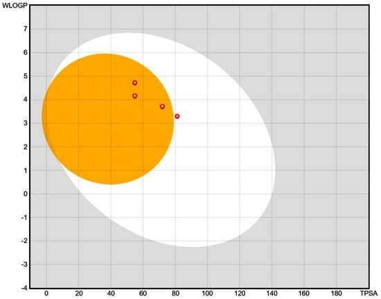 The absorption, distribution, metabolism, and excretion of the synthesized derivatives were determined using an online in silico method (SwissADME) based on various algorithms to predict the ADME parameters. The important parameters are presented in Table 5, and a boiled-egg plot was generated, where the egg white portion indicates high gastrointestinal absorption and the egg yolk represents compounds that can cross the blood–brain barrier (BBB), as presented in Figure 8. All the synthesized compounds were predicted to exhibit high gastrointestinal absorption and have the ability to cross the blood–brain barrier, except 5d, which was not able to cross the BBB. This in silico evaluation further indicated that all the synthesized compounds satisfied the Lipinski rules of five. The drugability of these compounds was also confirmed by applying a pan-assay interference compound (PAINS) filter, and none of the compounds exhibited significant similarities with the known PAINS. Thus, these synthesized compounds can be further evaluated and may be potential drug candidates [].