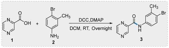 A 100 mL Schlenk flask was washed, oven-dried, and equipped with a magnetic stirrer bar. Pyrazine carboxylic acid (1.0 eq, 10 mmol), 50 mL DCM (Dichloromethane), 4-Bromo-3-methyl aniline (1.0 eq, 10 mmol), and DMAP (4-Dimethylaminopyridine) (0.2 eq, 20 mol%) were added to the flask. The reaction mixture was cooled to 0 °C in an isotherm while stirring continuously. Once the mixture reached 0 °C, DCC (N,N′-Dicyclohexylcarbodiimide) (1.1 eq, 11 mmol) was added, followed by an inert atmosphere. The isotherm was then removed. The reaction mixture was stirred at room temperature for 18 h and monitored by thin-layer chromatography (TLC). Upon completion, the reaction mixture was worked up with sodium bicarbonate solution followed by brine solution, using a separatory funnel. The organic layer was collected, and the solvent was removed with a rotary evaporator. The product was purified using column chromatography (hexane: ethyl acetate, 5:1) and then analyzed using spectroscopic methods (IR and NMR) [,].