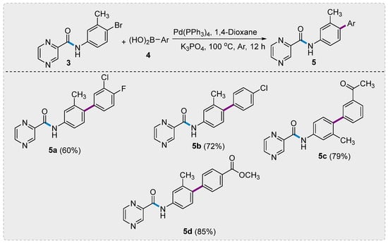 A dried Schlenk tube equipped with a stirrer was supplemented with N-(4-bromo-3-methylphenyl)pyrazine-2-carboxamide (1.0 equiv, 1 mmol), tetrakis(triphenylphosphine)-palladium (0.05 equiv., 5 mol%), K3PO4 (2.0 equiv., 2 mmol), and aryl boronic acid (1.0 equiv, 1 mmol). Then, 8.25 mL of a 10:1 mixture of 1,4-dioxane and water was added under an inert argon environment. The reaction mixture was heated to 90 °C for 24 h and monitored by TLC. After completion, the mixture was cooled to room temperature, and water and ethyl acetate were added. The organic layer was separated and dried over sodium sulfate. The product was then purified via a column chromatography [,].