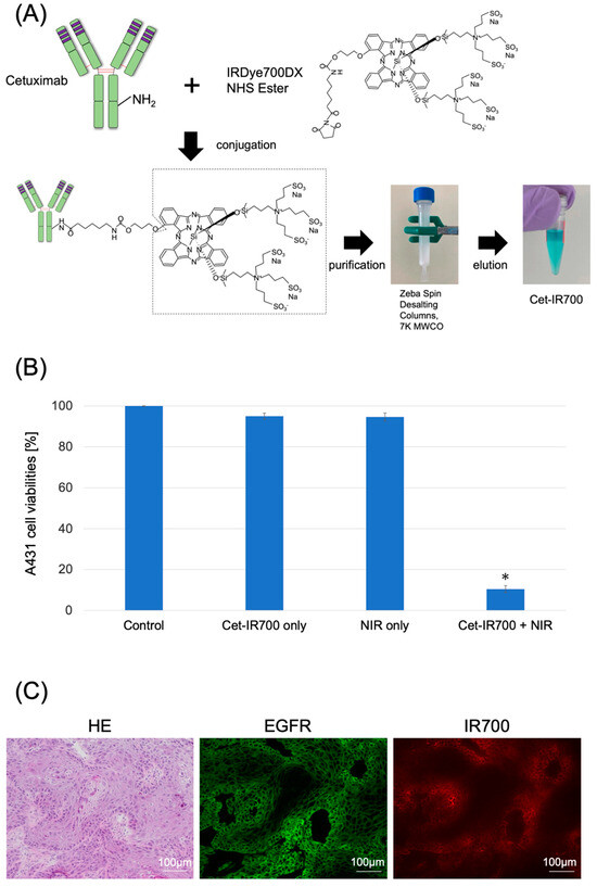 Cetuximab (chimeric [mouse/human] mAb) was conjugated with IR700 following the methodology outlined in our previous study (Figure 1A and Figure S1) [11]. We performed a cytotoxicity assay with Propidium iodide (PI) staining to quantitatively examine the effects of in vitro NIR-PIT. The combination of NIR and Cet-IR700 induced prominent cytotoxicity compared to the control (p < 0.05) in A431 cell lines (Figure 1B).
