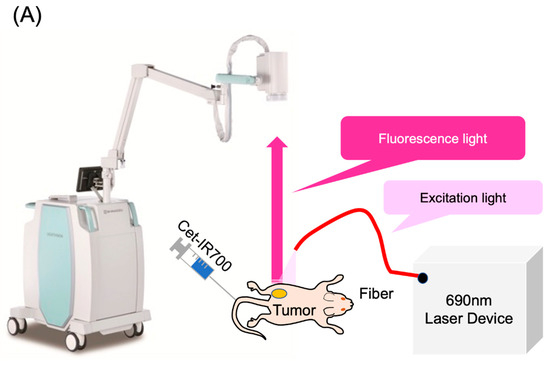 We employed LIGHTVISION (Shimadzu Corporation, Kyoto, Japan) to perform fluorescence imaging during NIR-PIT at a collection wavelength of ≥820 nm. The excitation source was a 690 nm laser emitted from a Shimadzu special laser module (peak wavelength 690 ± 5 nm). In NIR-PIT therapy, the laser dosage was 400 mW/cm² for cylindrical irradiation and 150 mW/cm² for frontal irradiation. In this setup, a cylindrical diffuser (RD-ML20, Medlight, Ecublens, Switzerland) responsible for emitting light from the laser device into the tumor was placed longitudinally within the tumor to facilitate intratumor irradiation. A frontal diffuser (FD1, Medlight), which emitted light onto the tumor surface, was positioned directly above the tumor. To target small tumors (70–110 mm3 in volume), the distance between the diffuser tip and the tumor was adjusted to ensure that the spot size was 15 mm in diameter on the tumor surface. Similarly, to target larger tumors (300–360 mm3 in volume), the spot diameter was set to 20 mm.
