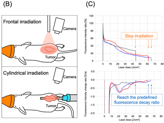 Based on this, we developed a system that stops NIR irradiation based on the tumor’s fluorescence decay rate using a real-time fluorescence imaging system termed LIGHTVISION. In this study, we investigated whether the NIR laser dose corresponding to the plateau in fluorescence decay rate can serve as the threshold for the antitumor effect of NIR-PIT across varying tumor sizes and irradiation methods. We hypothesized that the plateau of the fluorescence decay rate may be an indicator of the most appropriate irradiation dose.