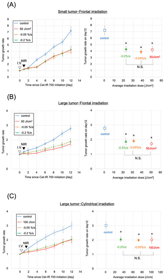 Antitumor effect by photoimmunotherapy. (A) Small tumor and frontal irradiation were measured. Data are means ± s.e.m. (n ≥ 11 mice in each group). (B) Large tumor and frontal irradiation were measured. Data are means ± s.e.m. (n ≥ 8 mice in each group). (C) The condition of a large tumor and frontal irradiation were measured. Data are means ± s.e.m. (n ≥ 8 mice in each group). Tumor volumes were measured from the initiation of Cet-IR700. Both the clinical dose and evaluation groups showed tumor suppression compared with the control group. Both the clinical dose group and the evaluation group showed significantly suppressed tumor growth on day 12 compared to the control group (p < 0.05, each group, analyzed using the Steel test). No significant difference was observed in tumor growth inhibition between the clinical dose and evaluation groups (analyzed using the Steel–Dwass test). The −0.05%/s and −0.2%/s groups demonstrated results with lower irradiation doses than the clinical doses. These results were observed under all three conditions. Notes: NIR, near-infrared light; * p < 0.05; N.S., not significant; Cet-IR700, cetuximab and IR700 conjugated antibody; s.e.m.: standard error of the mean.