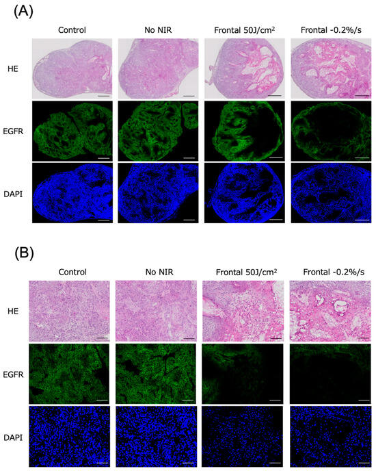 A series of histological changes were evaluated 24 h after NIR irradiation. Mice with A431 tumors were randomly divided into four conditions, as follows: (a) no treatment (control group), (b) Cet-IR700 injected without NIR irradiation, (c) −0.2%/s group, and (d) clinical irradiation condition (frontal irradiation, 50 J/cm2; cylindrical irradiation, 100 J/cm2). The laser dosage was 400 mW/cm2 for cylindrical irradiation and 150 mW/cm² for frontal irradiation, similar to our previous experiments [14]. The tumors were subsequently excised and frozen at −80 °C with an optimal-cutting-temperature compound (Sakura Finetek Japan, Tokyo, Japan). Frozen tumors were sliced into 6 μm serial sections and processed for fluorescence microscopy, EGFR immunofluorescence staining, and hematoxylin and eosin (H&E) staining. H&E staining was performed according to standard procedures.