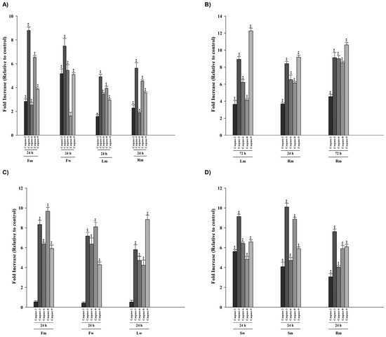 The impact of extracts at IC50 concentrations for each incubation period on caspases, key proteins that modulate the apoptotic response in cells, was assessed using a colorimetric protease kit. Cells were treated with extracts (¼ IC50, ½ IC50, IC50, 2× IC50, 4× IC50) for 24 h. Amino acid sequences unique to each caspase—caspase-2 (Ac-VDVAD-pNA), caspase-3 (Ac-DEVD-pNA), caspase-6 (Ac-VEID-pNA), caspase-8 (Ac-IETD-pNA), and caspase-9 (Ac-LEHD-pNA)—were used as substrates. The absorbance values of pNA released from the cleavage of pNA-labeled specific caspase substrates by caspases were quantified at 405 nm. The fold increase in activities of caspase-2, -3, -6, -8, and -9 induced by the extracts at IC50 concentrations for each incubation time was determined through direct comparison with the untreated control level (Figure 1 and Figure 2).