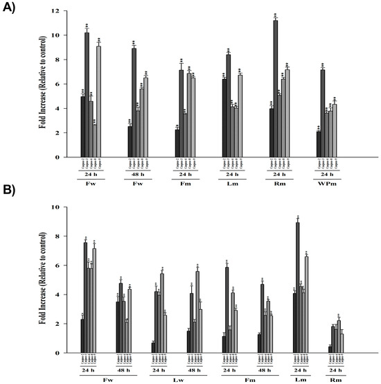 Effect of methanolic and water extracts at IC50 concentrations on caspase activities in (A) HT29 and (B) MCF7 cells. The student’s t-test was used to statistically analyze the data. When compared with the control group, statistically significant differences were defined as * p < 0.05, ** p < 0.01.
