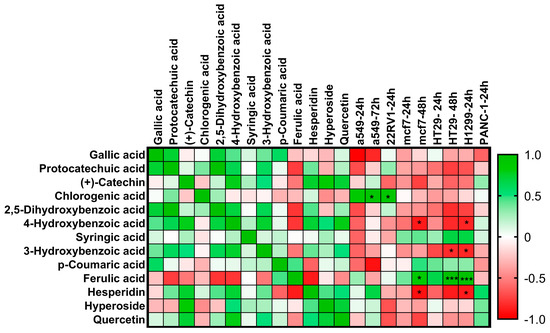 Pearson correlation analysis was employed to create a heat map of the correlation coefficient matrix between the IC50 doses of the extracts administered to A549, 22RV1, MCF7, HT29, H1299, and PANC1 and the variations in phytochemical levels in A. pisidicus methanol and water extracts. A bidirectional correlation heat map was created. Green and red color labels indicate positive and negative correlations, respectively. Significant values (*, p < 0.001; ***, p < 0.05) are indicated by those marked “*”; the color label indicates the Pearson correlation coefficient value. The evaluation did not include cell lines for which the IC50 dose could not be established.