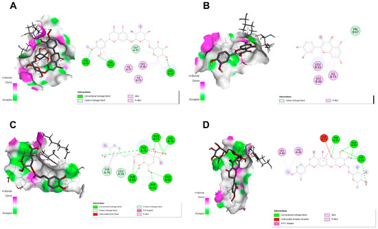 Three-dimensional interactions of (A) MDM2-hesperidin; (B) MDM2-quercetin; (C) XIAP-chlorogenic acid; and (D) XIAP-hesperidin complexes.