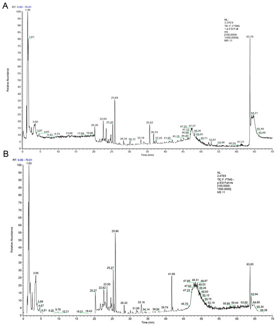 Total ion chromatograms of WLD by UHPLC-MS/MS. (A) Positive ion mode in the total ion flow diagram. (B) Negative ion mode in the total ion flow diagram.